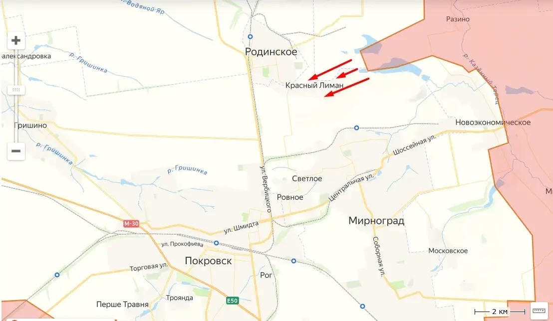 Здесь стоит отметить, что речь идёт не об одноименном городе на севере республики, который киевский режим переименовал в Лиман, а о селе Мирноградской городской общины, расположенного восточнее Родинского и северо-восточнее Покровска.