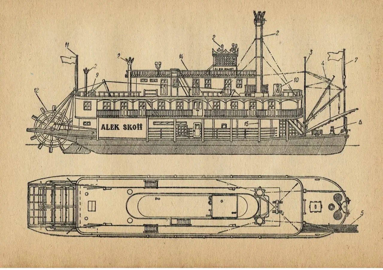 Артефакты истории техники. Сегодня у нас в некотором смысле день особый: 15 июля, середина лета, и «день исполнения желаний», вернее, одного моего давнишнего желания, напрямую связанного с нашим циклом о миссисипских пароходах 19 века. А было так, что в 1975 году, то есть ровно полвека назад, я купил книгу М. Михайлова и О. Соколова «От драккара до крейсера» с рассказами о различных кораблях и технологиях изготовления их моделей. Много там всего было интересного, но мне почему-то больше всего приглянулась модель парохода «Алек Скотт». Видимо, сказалась любовь к книгам Марка Твена. Но как и из чего сделать такую модель? В книге было всё просто: это взять, то приклеить, затем покрасить. Но как именно и из чего «это брать», «клеить» и «красить», не было в голове ни единой идеи.
