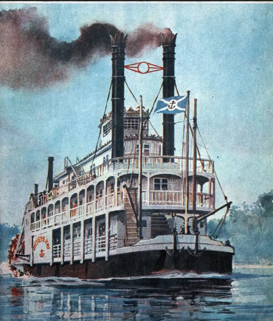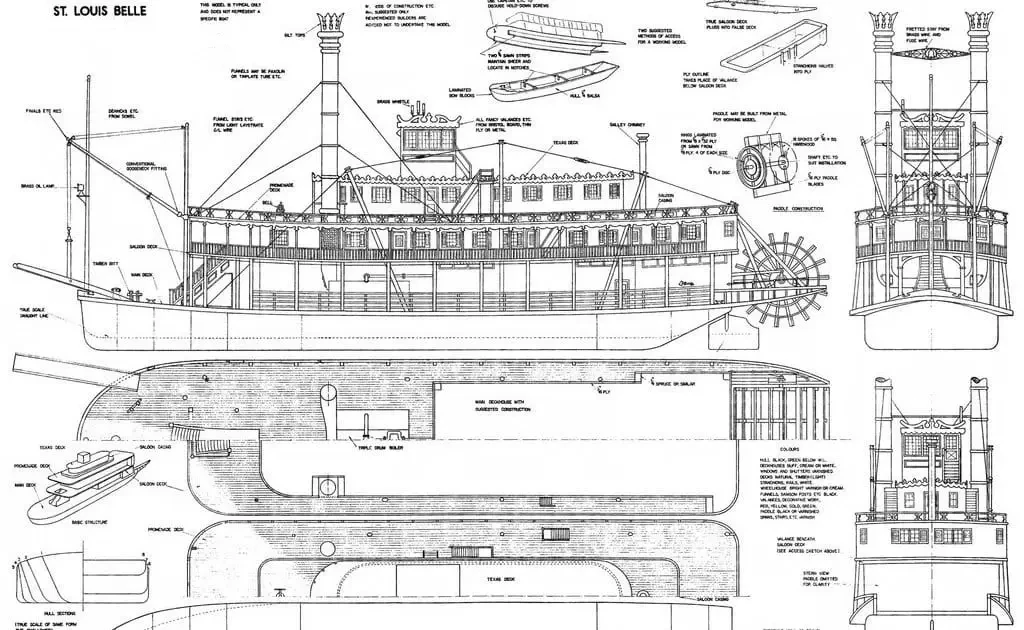 Кстати, если уж кто-то из наших читателей за оставшееся от лета время (и в отпуск) решит заняться постройкой модели «миссисипца», ему будет лучше использовать чертежи вот этого парохода: «Красавица Сент-Луиса». На мой взгляд, она более реалистична, нежели пароход из польского журнала. Тот очень уж какой-то узкий, а этот шире во всех отношениях. И паровые котлы с трубами под палубой на нем видно!