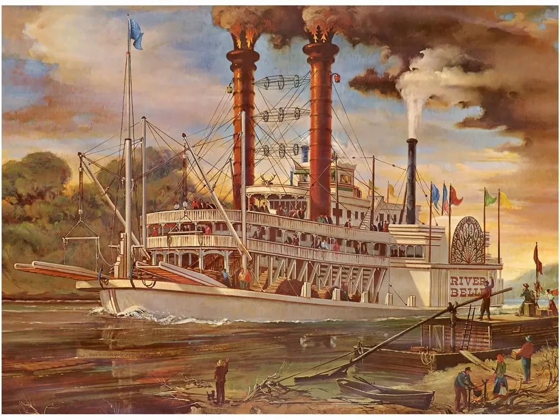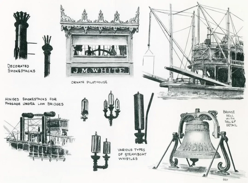 Пароход «Ривер Белле» украшали даже оленьи рога! А еще у него очень красиво были оформлены кожухи гребных колес… Иллюстрация Дина Корнвелла
