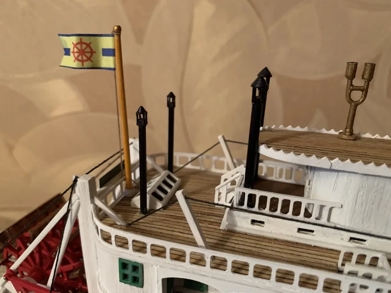 Надписи на ней выполнены из термодекалей. Окна и двери — 0 печать в 3D, перила и украшения вырезаны из полистирола толщиной 0,5-1 мм на станке с ЧПУ. Обшивка палубы и надстроек из сосновых и ольховых реек 1,5(2)х1 мм. Лестницы — нарезка лестницы фирмы «Амати» шириной 8 и длиной 90 мм. Трубы — латунные трубки диаметром 8 мм. Кольца на них из полистирола толщиной 1 мм, при ширине обода 0,5 мм. Паровые свистки выгнуты из полистиролового стержня толщиной 1 мм.