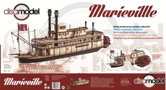 Интересно, что сегодня выпускается и сборная модель парохода «Мариевилль», о котором речь шла в предыдущем материале. Производит ее фирма «Дайзар»(Disar) в масштабе 1:72. Причем о ней я до этого времени ничего не слышал. Это очень крупный масштаб для судомодели, так что общая длина ее составляет 66,5 см, высота: 26,5 см, а ширина - 14 см.