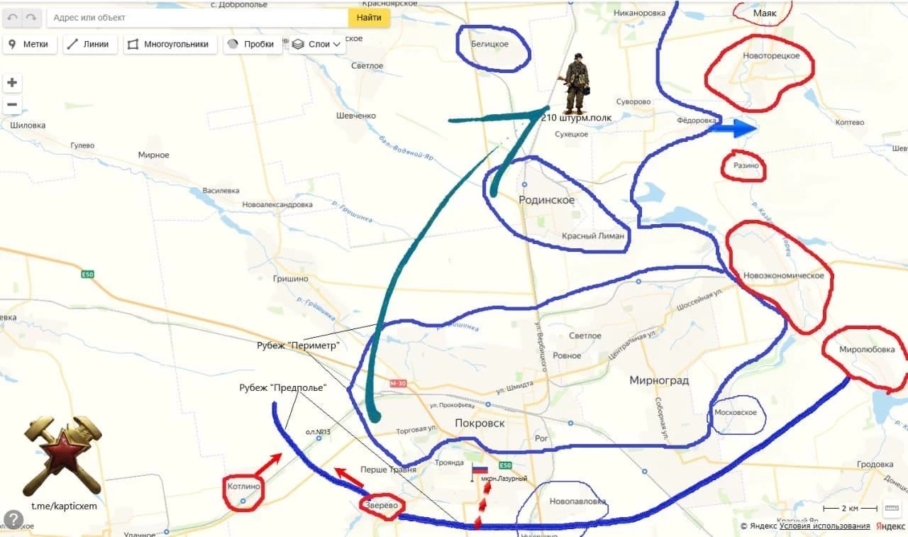 На Покровском направлении ВС РФ приблизились к границе Днепропетровской обл в районе Воскресенки. По последним данным с мест, в Покровске наши ДРГ орудуют вплоть до центра города и ж/д станции, но также ВС РФ навязали противнику бои уже на окраинах. Украинские источники считают, что в городе нет четкой линии обороны, обороняются ВСУ хаотично. Росийские дроноводы активно работают по логистике ВСУ. Ждём данных объективного контроля. Продолжается продвижение ВС РФ и со стороны Мирнограда, у Миролюбовки, что к югу от ранее освобожденного Новоэкономического. Севернее наши взяли под контроль большую часть Суворово.