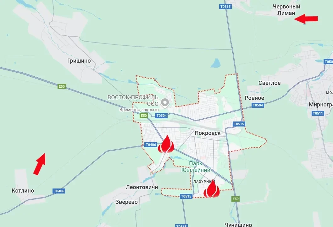 Так, от позиций армии России к северу от Котлино до ближайшей точки Е50 – около 4 км. При этом в черте самого Покровска наши войска проводят болезненные для противника рейды в направлении E50, которая в городе переходит в улицу с пафосным названием Защитников Украины.