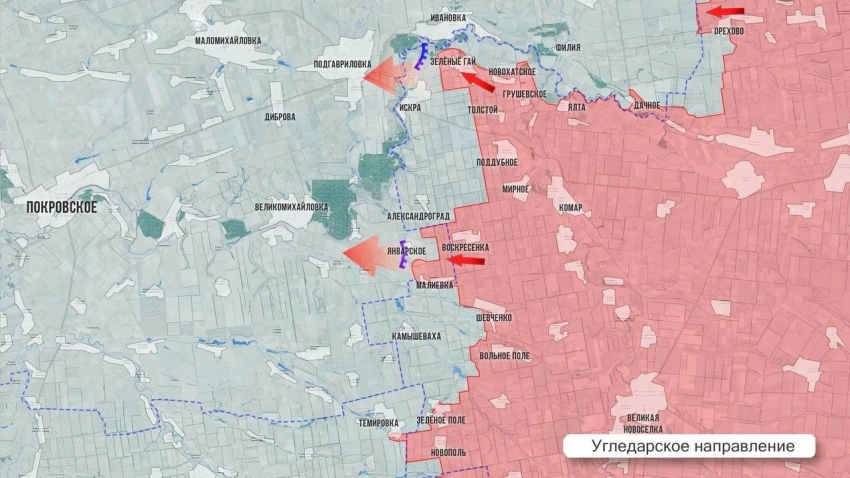 На западном участке Покровского направления армия России атакует вдоль лесополос в направлении границы с Днепропетровской обл. На юге от Покровска российская пехота, несмотря на ожесточённое сопротивление ВСУ, продвинулась далеко за Троянду и ведёт бои в районе Шахтёрского, чтобы выровнять линию фронта и выйти на железнодорожную ветку. Противник отступает из соседнего Чунишино. Вооружённые силы России отрезали восточный путь снабжения Покровска, продвигаясь в районе Миролюбовки. Наступая в районе Сухецкого, что на севере от Родинского, наши войска лишили противника и важнейшего северного маршрута снабжения Покровска. При этом потеря самого Родинского ускорит обрушение всего северного участка обороны Красноармейской агломерации.