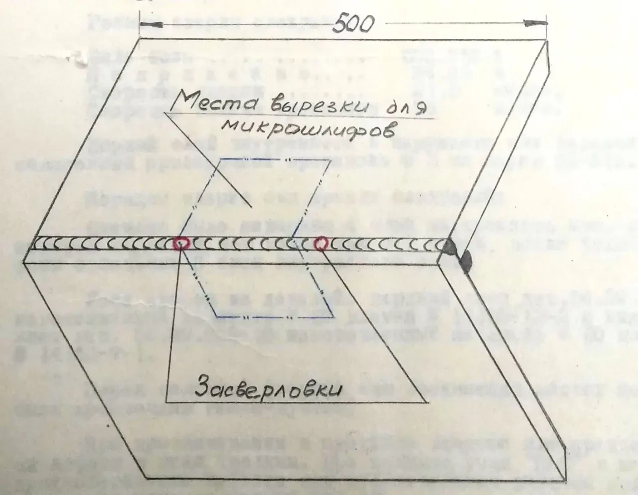 На втором образце были сделаны две засверловки. По засверловкам дефектов в сварных швах не обнаружено. Из средней части образца был вырезан участок для макро- и микроисследования.