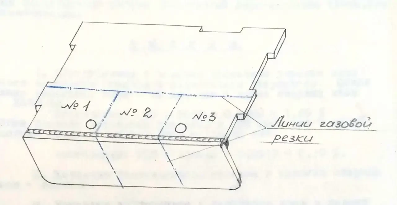 При просвечивании в наружном сварном шве предполагался дефект в виде трещины. При поломке узла "НОС" в месте предполагаемого дефекта при просвечивании выявлен подкол по основному металлу. Для облегчения поломки и получения изломов по сварным швам узел был прерван газовой резкой на три разных участка, которые затем были поломаны под прессом.