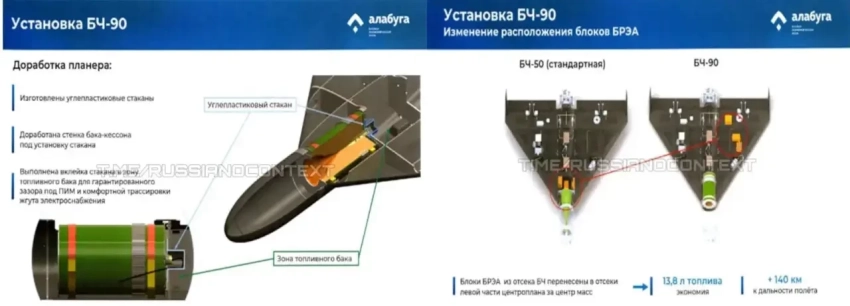 Впрочем, простым повышением могущества БЧ дело не ограничилось – судя по информации, размещённой в открытых источниках, для БПЛА-камикадзе семейства «Герань» были созданы также кассетные БЧ.