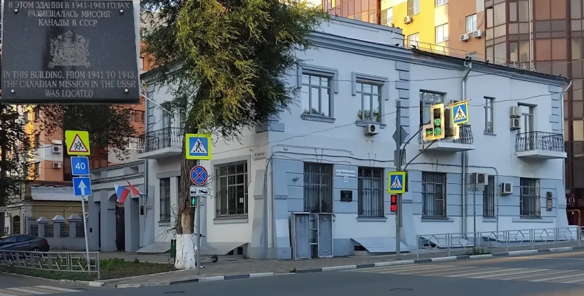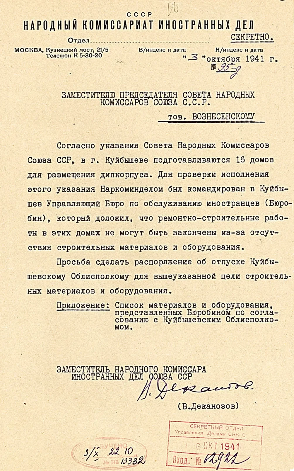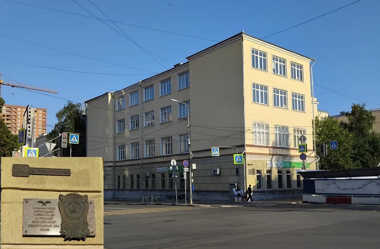 Эвакуированные в Куйбышев сотрудники Народного комиссариата иностранных дел (НКИД) прибыли в город 20 октября 1941 года одновременно с дипломатическим корпусом. Для размещения аппарата НКИД было выделено здание по адресу Галактионовская, 141. Это историческое сооружение было построено в 1894-1898 годах по проекту губернского архитектора Александра Щербачёва для Первой мужской гимназии. В предвоенный период здесь располагался Куйбышевский коммунистический университет.