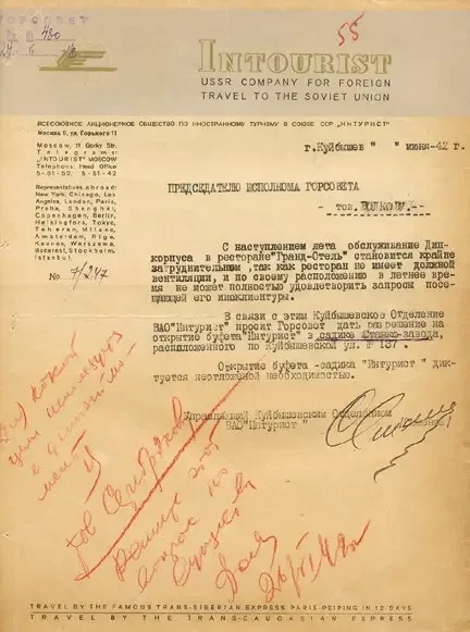 Письмо управляющего Куйбышевским отделением ВАО «Интурист» Семенова председателю горисполкома П.П.Волкову об открытии летнего ресторана для дипломатического корпуса. 24 июня 1942 года