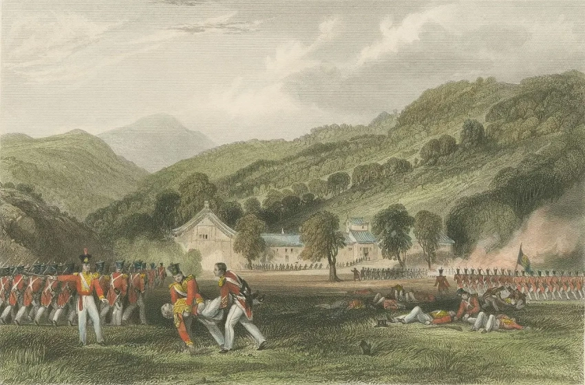 Британцы решили преследовать отступающих, но в сельской местности успехи у них были значительно жиже, более того, 29 мая толпа из 20 тысяч китайских крестьян с ножами и самодельными пиками окружила отряд из 60 сипаев, загнала их на рисовые чеки и осаждала там два часа, убив четверых и ранив порядка 20 человек. Когда на помощь сипаям пришло подкрепление, солдаты смогли отступить в захваченный накануне форт, который также был осаждён крестьянами (китайские источники уверяют, что один из солдат изнасиловал жену местного жителя Вый Шаогуана, потому крестьяне так и взбеленились). Генерал Хью Гоф, главнокомандующий британскими войсками в Китае, направил сообщение губернатору Гуанчжоу Юй Баочуню, что если толпа не разойдётся, то он сравняет Кантон с землёй, и тот призвал крестьян разойтись. Мелкий эпизод, но в современном Китае его раздули до полноценного национального мифа: народное сопротивление захватчикам и трусливый цинский чиновник, призывающий героических крестьян разойтись...