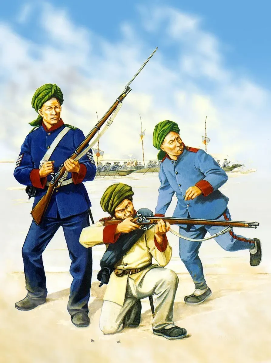 Дело в том, что маньчжурские армии разваливались под ударами тайпинов как карточные домики, но когда тайпины подошли к Шанхаю, местные олигархи обратились за помощью к американскому авантюристу Фредерику Таунсенду Уорду. Тот, за китайское серебро, навербовал отряд из 200 европейцев: моряков, дезертиров, авантюристов. Отряд, вооружённый современным оружием, отстоял Шанхай, выполняя роль пожарной команды: Уорд со своими людьми спешил туда, где цинские войска могли дрогнуть и отступить. Он отстоял Шанхай, после чего отбил у тайпинов Нинбо. Но самое страшное для повстанцев было то, что американец смог масштабировать свой успех. В 1861 году он сделал из европейцев своего отряда офицеров. А в качестве солдат набрал 1200 китайцев из Сунцзяна. Их обучили по всем правилам европейской военной науки, после чего повторили набор. В мае 1862 года у Уорда был уже 3000 хорошо вооружённых, обученных и мотивированных (платили американцу и его воинству китайские банкиры, и денег не жалели!) бойцов (включая отряд из 300 телохранителей-филиппинцев). Уорду присвоили звание мандарина 3-го ранга, а его отряду название «Вечно победоносная армия».