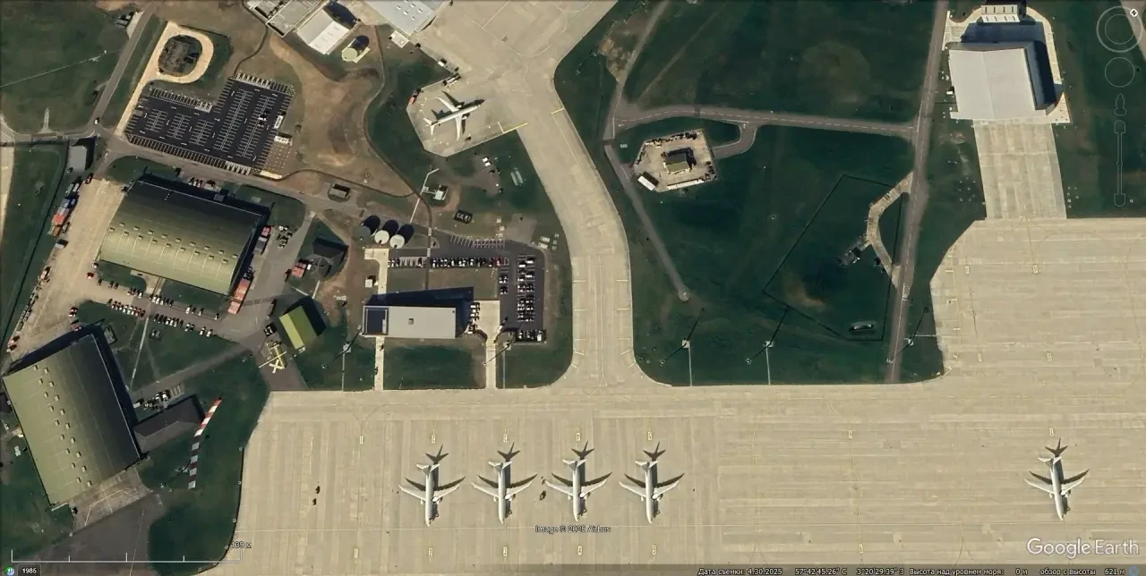Спутниковый снимок Google Earth: самолёты Boeing P-8А Poseidon на британской авиабазе Лоссимут. Снимок сделан в апреле 2025 года