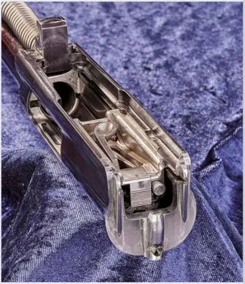 А вот что там есть- так это характерный для переломных охотничьих ружей верхний ключ затвора над шейкой приклада. Неужели эта самозарядка переломная!? Так и есть.