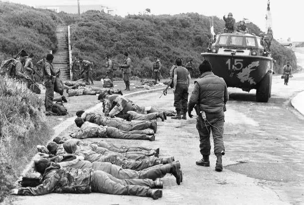Интересная деталь: аргентинцы описывают штурм казарм Мунди-Брук именно так, как я рассказал выше (британских воспоминаний об этом моменте, по понятным причинам, не осталось). Британцы же, после возвращения на острова, описывали, что казармы были изрешечены пулемётными очередями, а внутрь закинули не гранаты со слезоточивым газом, а гранаты с белым фосфором. Аргентинская сторона уверяет, что следы пуль — от обстрела казарм истребителем-бомбардировщиком «Харриер» при освобождении островов, но наличие следов белого фосфора никак не комментирует.
