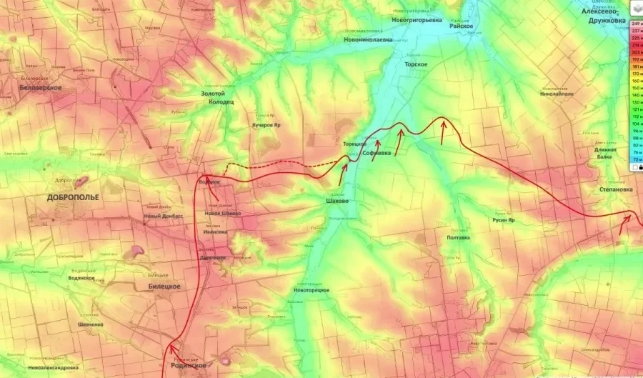 Северо-восточнее, в районе Шахово, российские войска ведут наступление в сторону Торецкого и Софиевки. Софиевка уже находится под контролем ВС РФ, за Торецкое продолжаются бои. Отмечается высокая плотность вражеских беспилотников в воздухе.
