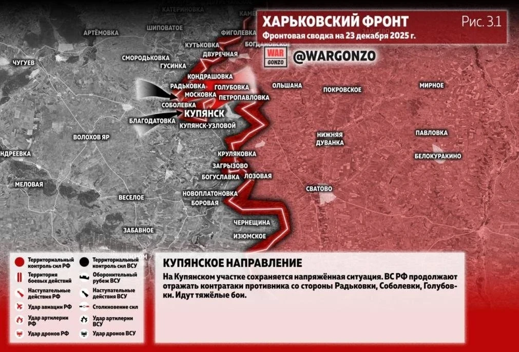 Свежие данные, поступающие сегодня с Купянского направления, позволяют сделать следующий вывод: Вооружённые силы Украины (ВСУ), не считаясь с потерями, пытаются восстановить контроль хоть над какой-то частью Купянска. Вместе с этим российские войска продолжают уверенное наступление на практических всех участках фронта СВО. Наш сайт N4k предлагает ознакомиться с последними новостями из зоны проведения СВО, а также публикует свежую карту боевых действий, актуальную на 23.12.2025.
