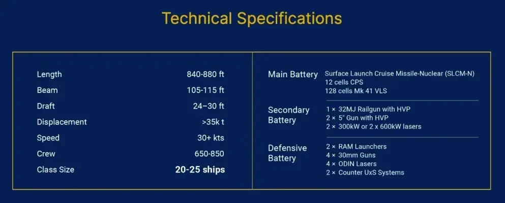 Тем временем NAVSEA поделилась некоторыми дополнительными подробностями об ожидаемых возможностях военных кораблей класса «Трамп». В нынешнем виде длина судов должна составлять от 256 до 268 метров, ширина — от 32 до 35 метров, водоизмещение — не менее 35 000 тонн, а максимальная скорость — более 30 узлов.