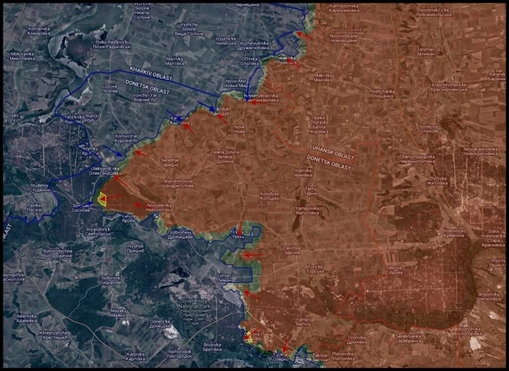 Денацификация территории к югу от Северска продолжается. Идут бои в Резниковке, наши войска продвигаются полями к северу и югу от дороги на Рай-Александровку.