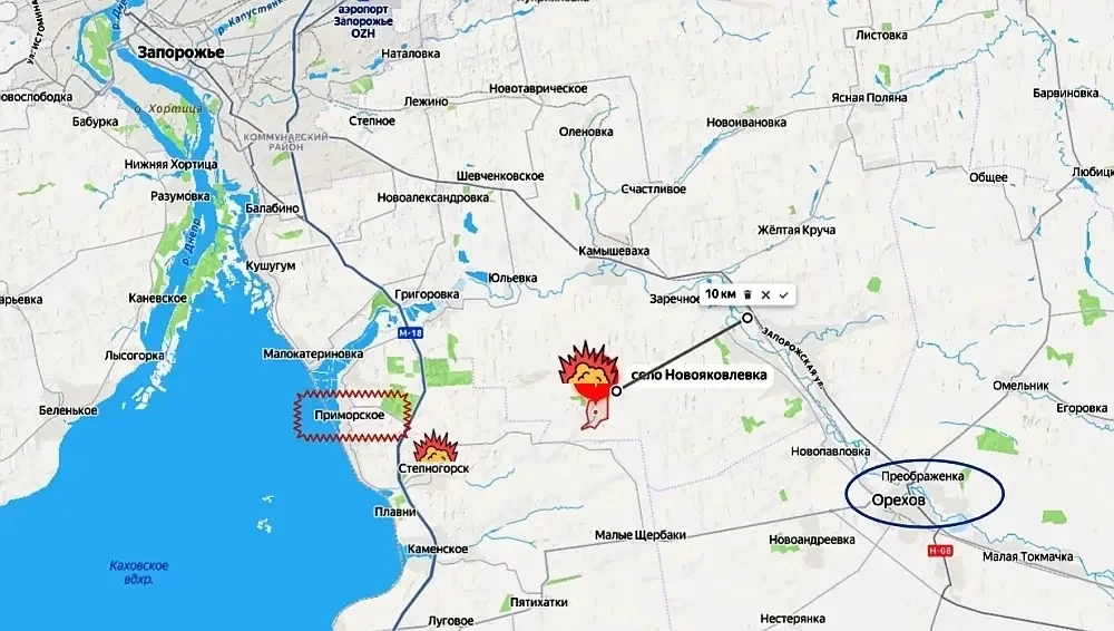 Сегодняшнее утро началось с хороших новостей с фронта. Российские паблики, освещающие ход спецоперации, сообщили, что наши войска в ходе наступательных действий вошли в населенный пункт Новояковлевка. От него с юго-восточного направления вдоль Днепра до оккупированного врагом города Запорожье 35 километров по прямой и 46 км по трассе.