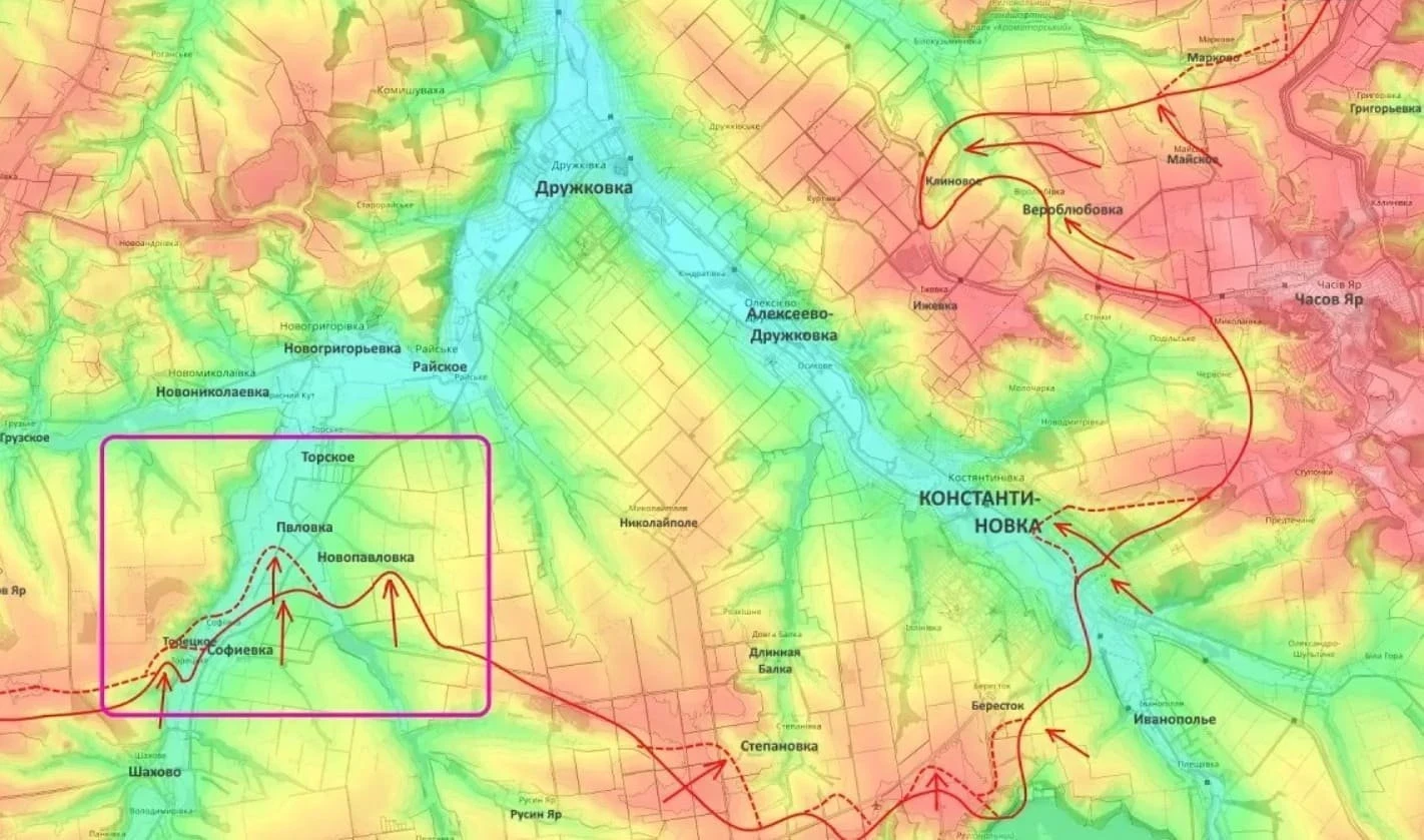 Согласно сведениям блогера, российские военные также ведут ожесточённые бои к северу от Константиновки - в окрестностях населенных пунктов Веролюбовка и Марково.