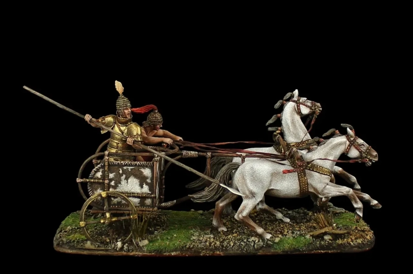 Но для того времени и она была по-настоящему грозным оружием. Воины в колесницах метали в противника один дротик за другим, поскольку имели их запас, легко при этом уклоняясь от ближнего боя. Их можно было использовать и как передвижные командные пункты, и для преследования отступающего противника, чтобы опять же швырять дротики в спины бегущих.