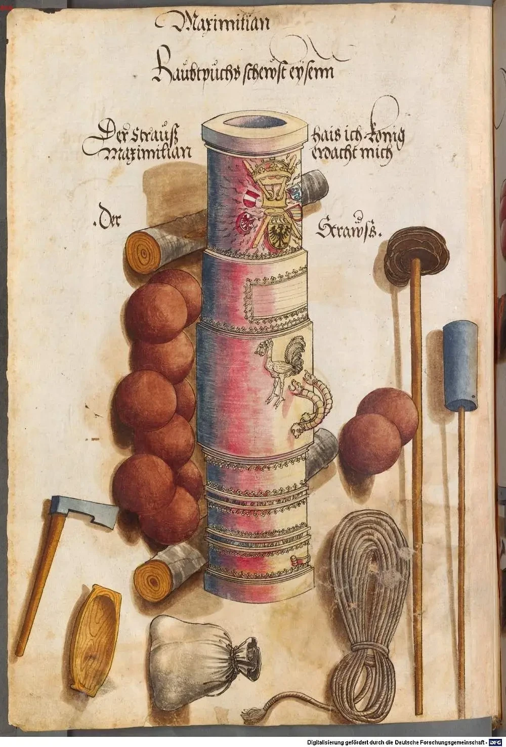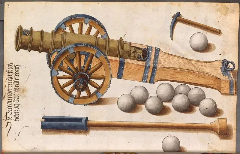 Литая бомбарда с выпуклыми узорами и гербами на стволе. Рядом с ней принадлежности, включая «корыто» для пороховой смеси и «лопата» шуфла для его загрузки в ствол. Здесь же банник и моток веревочного фитиля. Иллюстрация из «Книги вооружения» Бартоломеуса Фрейслебена. Ок. 1502 г. Баварская государственная библиотека, Мюнхен