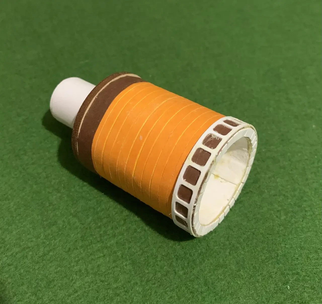 Затем края обрабатываются наждачной бумагой, а сам ствол оклеивается полосками бумаги толщиной 2-3 мм из наборов для квиллинга. Поскольку орудия того времени имели составной ствол и задняя его часть часто была уже, чем передняя, сзади был приклеен пустой пластмассовый колпачок от… губной помады, также оклеенный для этого бумагой. В самой задней его части было просверлено запальное отверстие.