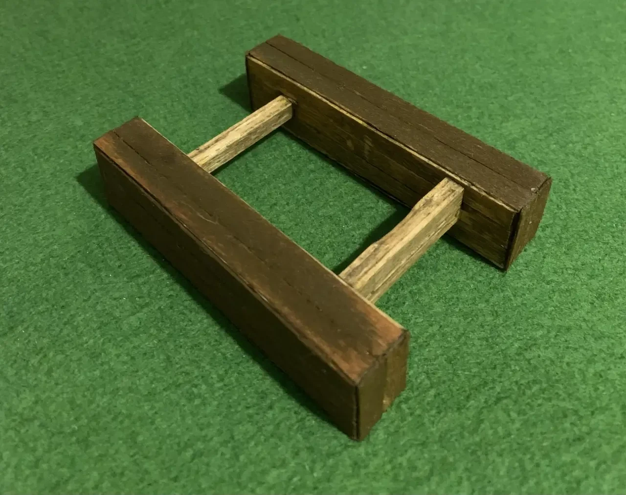 Лафет орудия очень простой. Две «коробочки из упаковочного картона, оклеенные полосками шпона. Между собой они соединены пропущенными через их стенки «балками» из четырех палочек-мешалок, склеенных между собой.