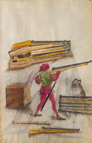 Однако как раз в области военного дела, оружия и боеприпасов конца XV – самого начала XVI века есть прекрасно иллюстрированный манускрипт, составленный Бартоломеусом Фрейслебеном (специалистом по вооружению) на службе у императора Священной Римской империи Максимилиана I (1459–1519 гг.). Этот манускрипт получил название «Книги вооружения», и вот как раз в нем имеется множество прекрасных цветных иллюстраций. Дело в том, что Максимилиан I стремился укрепить свою армию и потому приказал Бартоломеусу составить опись всего, что содержалось в его арсеналах, чтобы иметь точное представление о своей военной мощи.