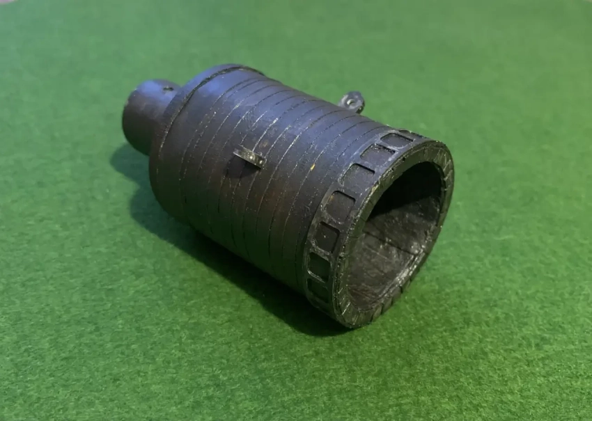 Готовый ствол средневекового орудия, явно похожего на «Пумхарт фон Штайр», перед покраской. Декоративная деталь из белой пластмассы на конце ствола – кусок пластмассовой… изгороди из набора заборчиков для макетов железной дороги. Сегодня такие наборы можно легко заказать через Интернет. Фотография автора