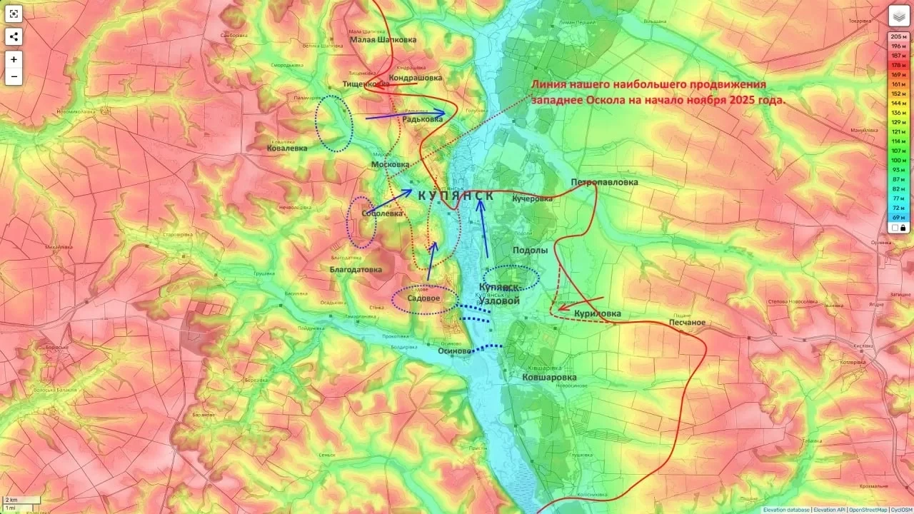 Вторая, более значимая задача реализуется на восточном берегу Оскола. Здесь российские войска наступают через Песчаное и Куриловку с целью выхода к стратегически важным переправам в районе Купянска-Узлового. Реализация этого замысла позволяет лишить украинскую группировку на левом берегу реки устойчивой логистики.