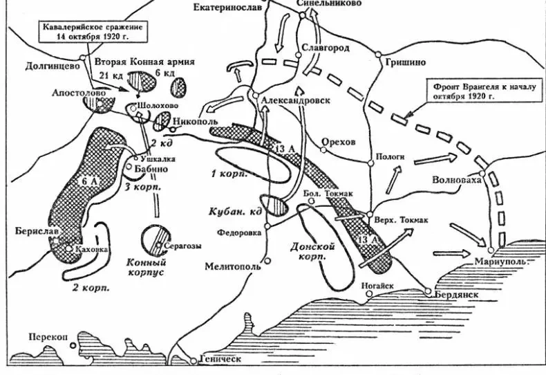 Прежде всего Фрунзе договорился с Махно, который 2 октября согласился возобновить союз с большевиками и обязался выставить 12 тысяч бойцов при 500 пулеметах и 10 пушках. Белые ещё надеялись на успех и 8 октября, форсировав Днепр, захватили город Никополь и важную железнодорожную станцию Апостолово.