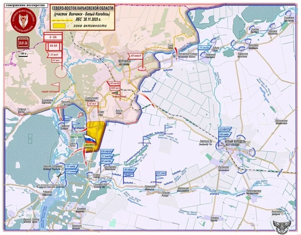 Район Старицы и Симиновки: штурмовики выбивают врага из лесных массивов. В ходе отражения контратак 159-й омбр ВСУ и спецназа ГУР уничтожено до 60% личного состава штурмовых групп противника. Эффективно работают тяжелые огнеметные системы ТОС-1А «Солнцепек».