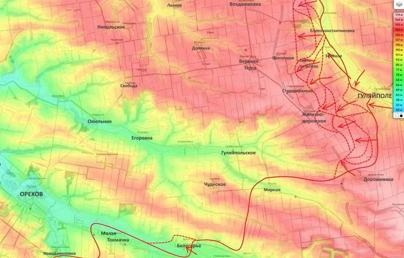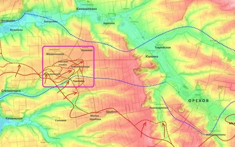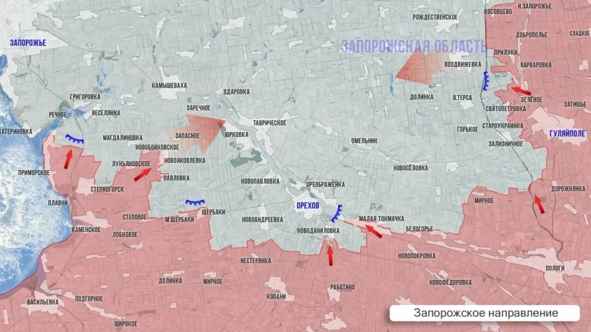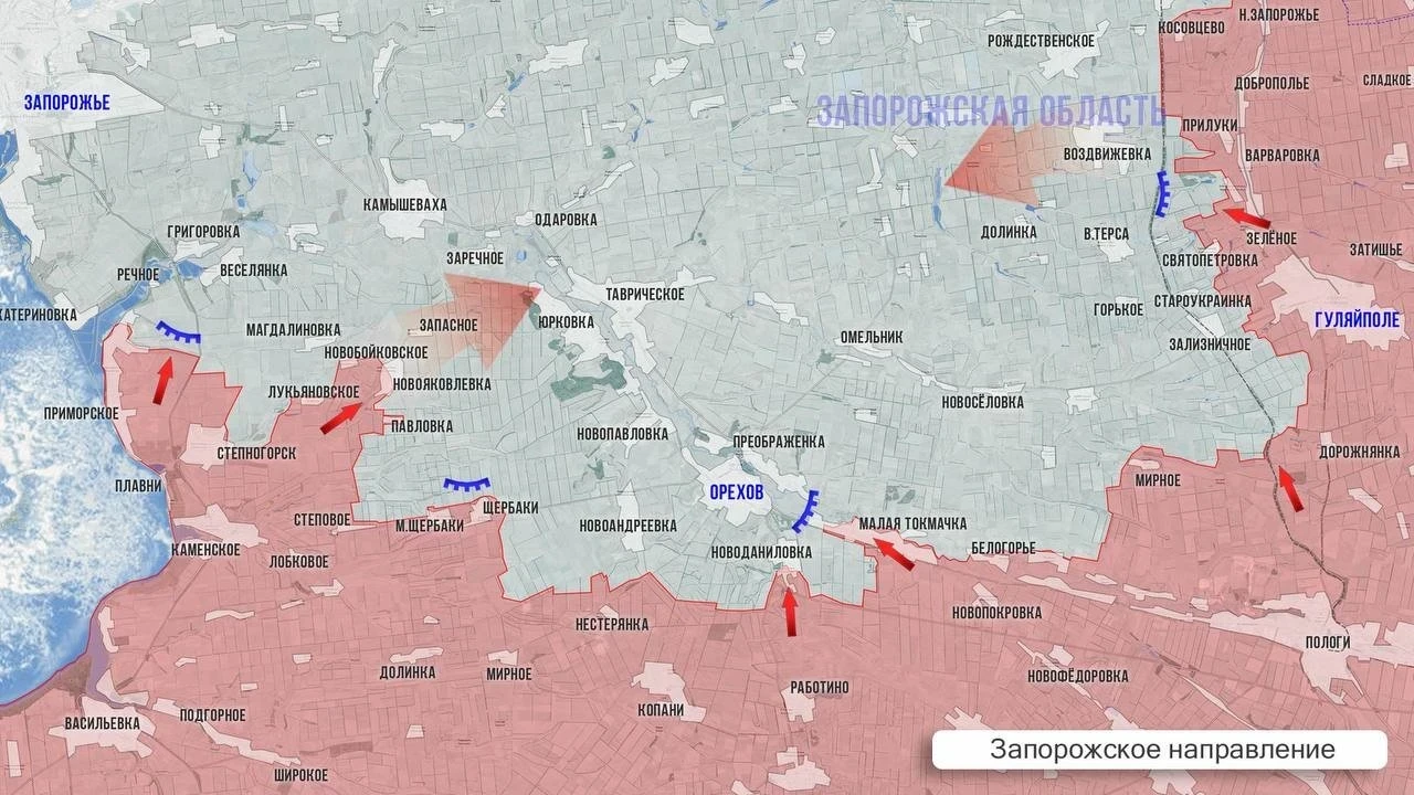 После этого, по его словам, ВСУ придется опираться дальше на линию реки Конка, населённые пункты Речное, Веселянка, Запорожец, Камышеваха, Заречное, а затем на Юрковку и Орехов.