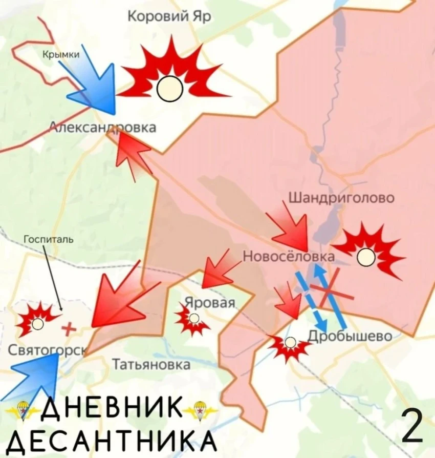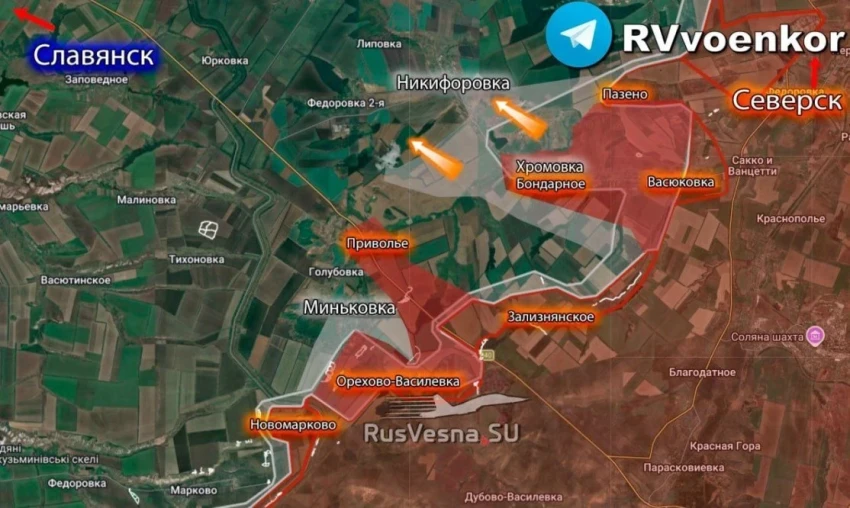 На Северском направлении армия России закрывает «карман» между Никифоровкой и Привольем, приближается к Федоровке Второй. Дальнейшее продвижение в этом направлении позволит расширить фронт наступления к ключевой Рай-Александровке.