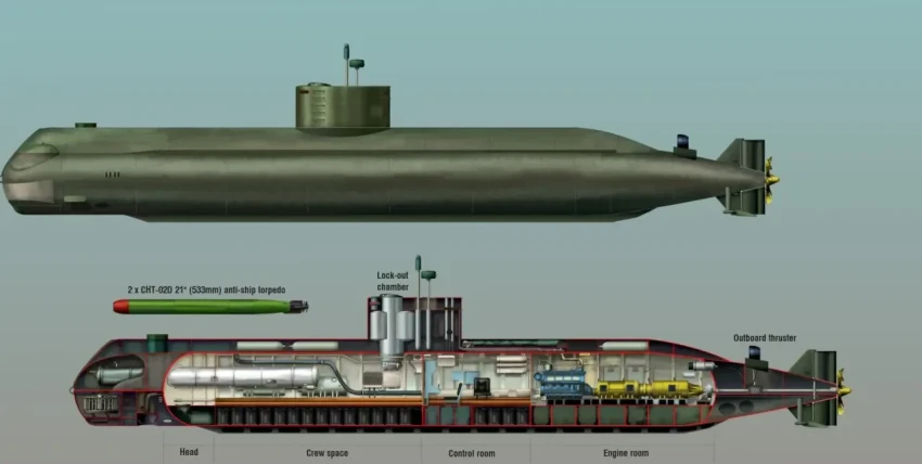 Водоизмещение – около 22 т, главные размерения – 17 х 3,3 х 3,5 м. Для движения используются раздельные силовые установки: в надводном положении служат два дизеля, работающие на свои винты и два руля, а в подводном – 2 электродвигателя, работающие на другие винты в насадках и рули. Надводная скорость составляет 40 узлов, подводная – 3. Для работы дизеля под водой на глубине до трех метров служит шноркель. Глубина погружения не менее 20 метров. Катер вооружен двумя 324-мм торпедными аппаратами для самообороны, РЛС, эхолотом, видеокамерой и может перевозить до восьми человек, включая спецгруппу.