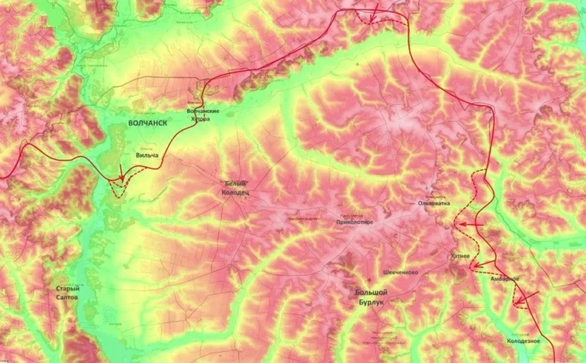 Параллельно группировка, наступающая со стороны Волчанска, прорывает оборону вдоль восточного берега Северского Донца в обход Белого Колодезя. Замысел командования - соединить эти две группировки, обрушить оборону и выйти на оперативный простор.
