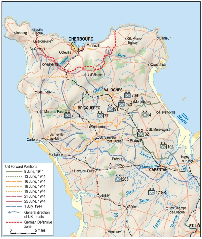 Взять Шербур с ходу не удалось из-за упорного сопротивления немецких частей, и бои продлились с 6 июня до 1 июля. 18 июня американские войска отрезали немецкие войска на севере полуострова Котантен, а через два дня три дивизии «янки» штатной численностью 45 000 человек начали штурм портового города.