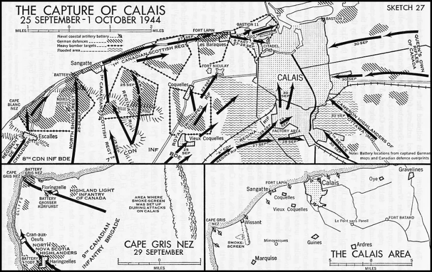 На этот раз союзники совершили «благородный акт» — по просьбе немецкой стороны позволили мирным жителям Булони и Кале покинуть места боев. Кроме сотен бомбардировщиков наступление канадцев поддерживала дальнобойная береговая артиллерия с английского побережья. К 30 сентября в руках союзников оказался участок побережья от Шербура до Кале, в плен попало около 30 тысяч немцев, потери их противников составили около 1500 человек. Но порты были надолго выведены из строя.