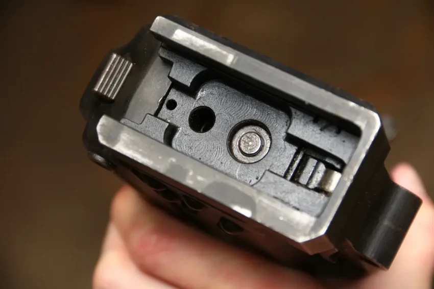А вот задняя часть ствольной коробки ПКТ со снятым блоком электроспуска и, соответственно, без гашетки. Кстати, фото этого пулемёта взято с сайта по продаже макетов оружия, и конкретно этот ПКТ можно купить.