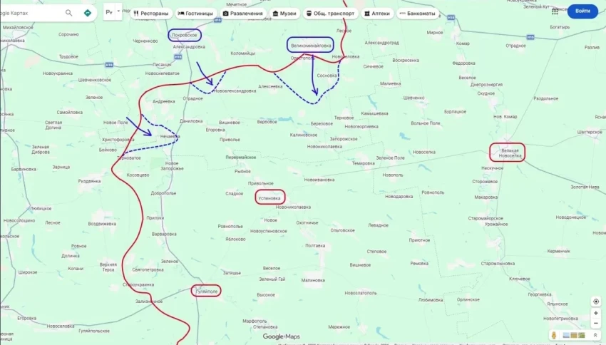 Противник наносит удар из районов Покровского и Великомихайловки (Днепропетровская область). Цель - прорвать позиции 29-й общевойсковой армии РФ, выйти на рубеж Зеленое Поле - Успеновка и зайти в тыл наступающим группировкам 36-й и 5-й армий.