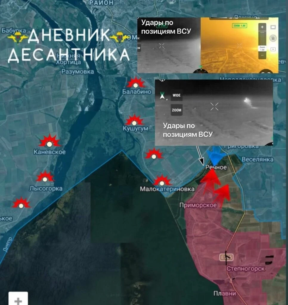 На Запорожском участке (район Приморского) российские войска наносят огневое поражение группам ВСУ в Приморском, Речном и в глубине обороны, не форсируя пока реку Конка.