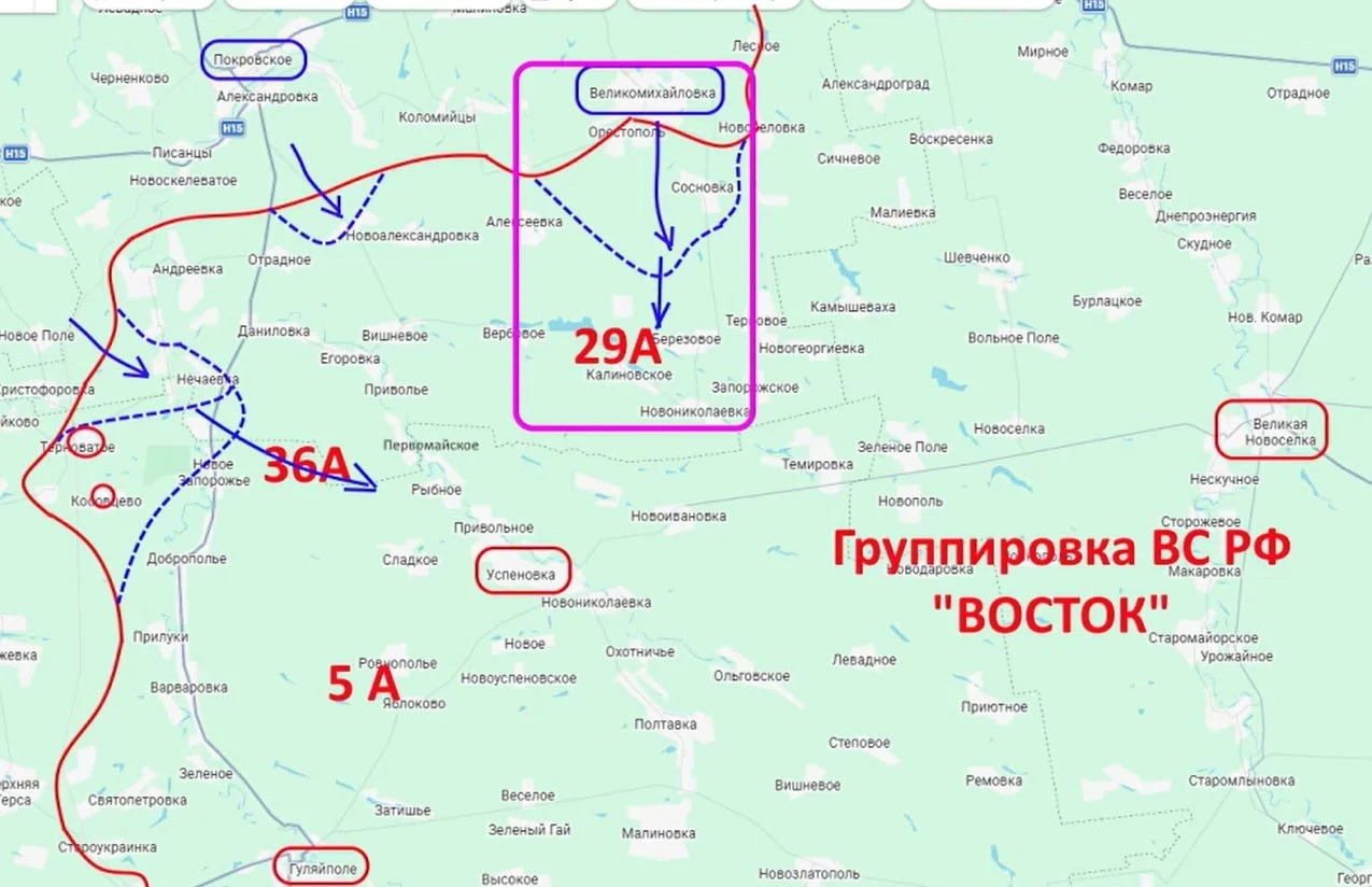 «Слабым местом он посчитал второй участок, район Берёзового. И именно сюда он нанёс удар. И прямо сейчас противник пытается зайти и закрепиться на окраинах Березового, чтобы выйти в тыл 36-й армии, которую, в свою очередь, атакуют из района Нечаевки, Новое Запорожье, Рыбное, Сладкое. То есть, противник сумел закрепиться в Нечаевке и в Новом Запорожье, а также блокировать части наши, которые удерживают ещё оборону в районе Терноватого и Косовцева», - заметил Подоляка.