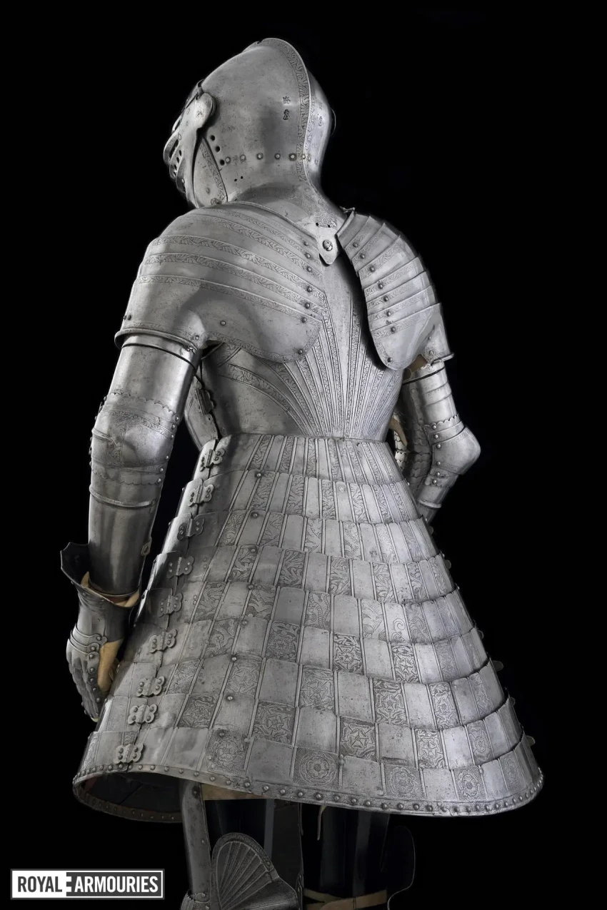 Так появился второй комплект доспехов, и тоже для пешего поединка. Собрали его как конструктор из уже готовых деталей, вероятно, выполненных разными мастерами в разное время. Но вот украсили его уже в едином стиле, чтобы никто ничего «такого» не подумал! В отличие от предыдущего доспеха, этот доспех имел «юбку» (тонлет) в форме колокола, из металлических полос, приклепанных к кожаной основе. Такая конструкция позволяла уменьшить вес доспеха и трудоемкость его изготовления за счет отказа от защитных деталей для ног выше коленей. Щитки на внешней стороне наколенников («раковины») в данном случае имели вид бантов на модных в то время подвязках.