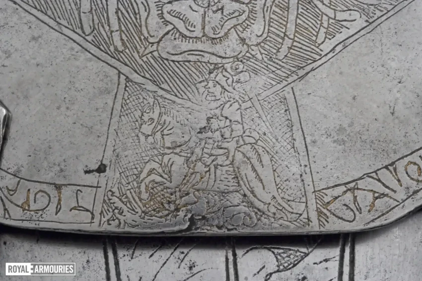 Доспех был отделан травлением и до сих пор сохраняет следы позолоты. Среди выгравированных на нем изображений можно увидеть Святого Георгия и Богородицу с Младенцем. Они находятся по обеим сторонам бацинета и на обоих наплечниках. Цепь ордена Подвязки окружает шею бацинета, а само изображение подвязки можно видеть на ноге слева. Юбка украшена гравировкой, изображающей стилизованные листья в верхних рядах, а ниже – розу Тюдоров. Вполне возможно, что оригинальная отделка доспеха изначально была черной, что создавало яркий черно-золотой клетчатый узор. Размеры доспеха указывают на то, что сделан он был на человека ростом никак не меньше 1875 мм. Вес доспеха 29,28 кг.