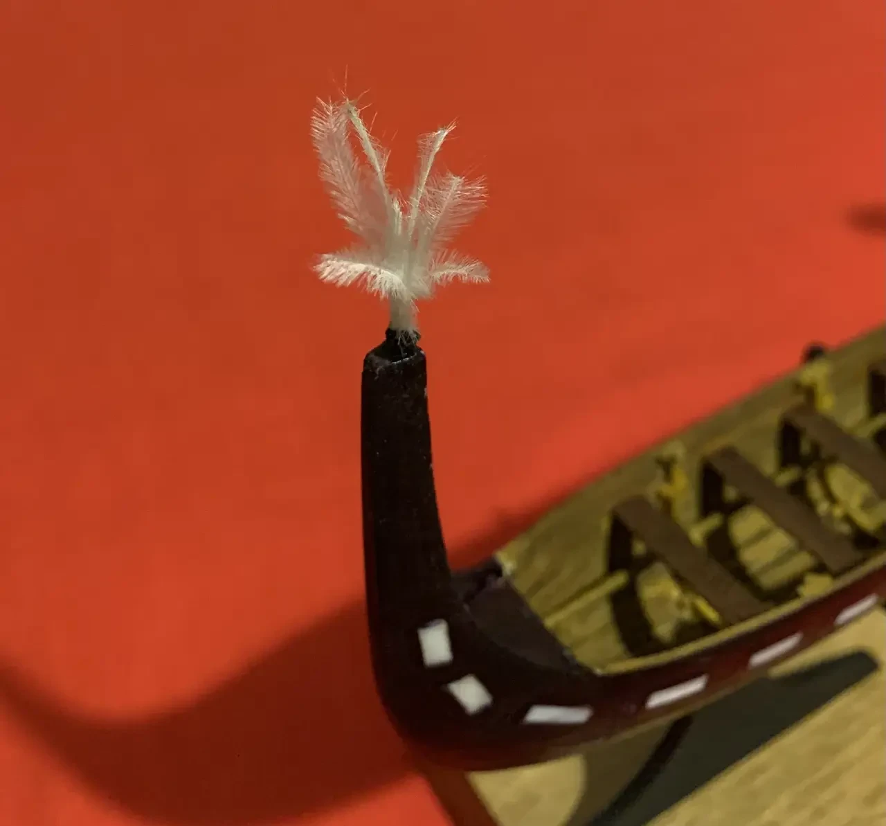 Перья в масштабе пироги, а длина ее, кстати говоря, ровно 29 сантиметров, найти очень сложно. Но я нашел выход из положения, воспользовавшись для изготовления кормового украшения пером страуса – просто отрезал от него несколько пушистых «волосинок»…