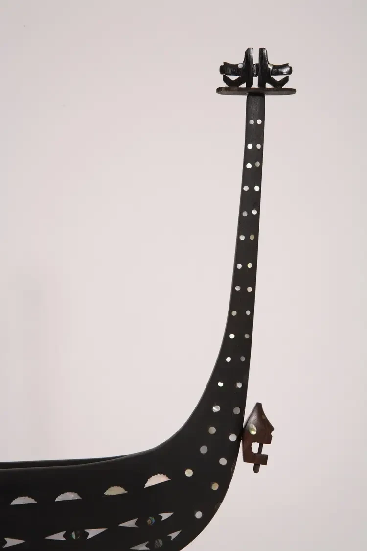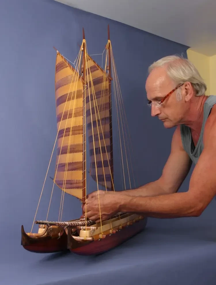 Но вот прошло 60 лет, и я наконец-то смог осуществить мечту своего детства, то есть сделать модель пироги охотников за головами с Соломоновых островов. А началось всё с того, что в Интернете я обнаружил сайт моделиста с Гавайских островов Френсиса Пиммеля. Занимается он тем, что мастерит модели различных полинезийских судов, которых, как оказалось, на Тихом океане превеликое множество: на каждом архипелаге свой тип пироги и свои украшения. И как среди его моделей нашлась и пирога с Соломоновых островов, причем с корпусом, инкрустированным кусочками перламутра от раковин. Решил повторить ее, заказал перламутр с острова Бали, поскольку модель для самого себя должна иметь «аромат далеких островов».
