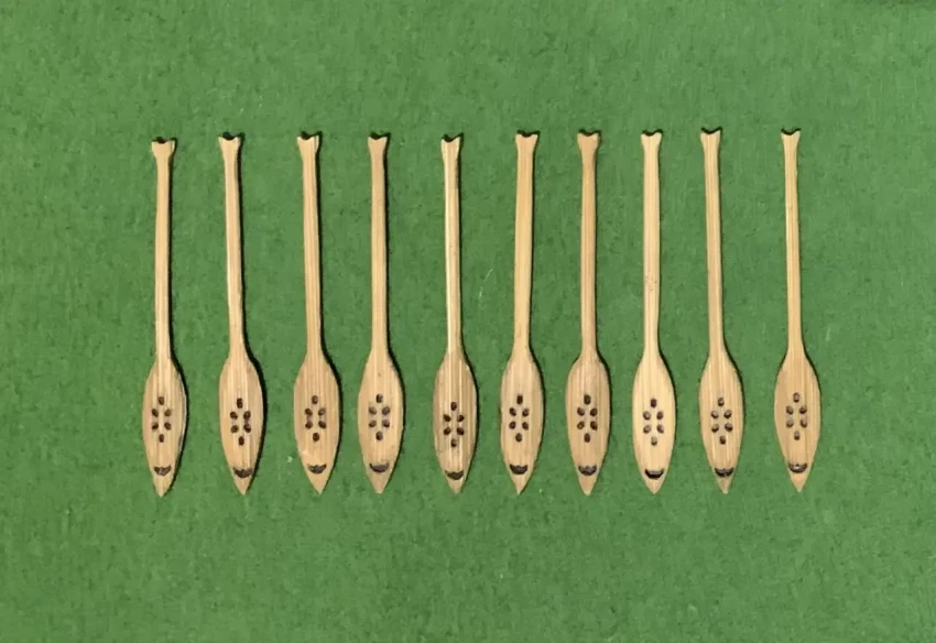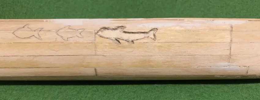 На эту самую пирогу нужно целых десять совершенно одинаковых весел, причем желательно, чтобы их украшали хоть какие-то резные узоры… Сделать точно такие же весла достаточно сложно. Но я в данном случае использовал планки от старого китайского веера. Снял с него ткань, после чего обрезал пластинки по размеру, вложил между ними черную копировальную бумагу и склеил клеем ПВА. Теперь сквозных прорезей на веслах не было, а были очень даже практичные заготовки, которые осталось только лишь обточить требуемой формы и чтобы рукоятки у них были круглыми.