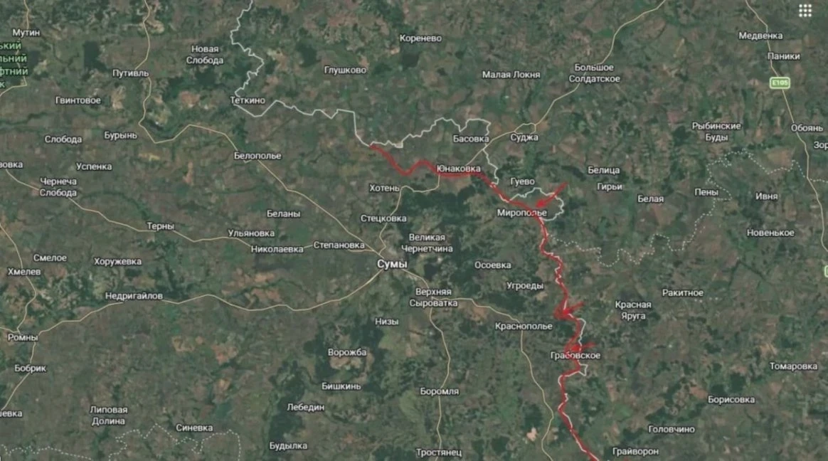 «Сумское направление. Здесь наши войска продолжают теснить противника. И всё более очевидно, что формируется так называемая новая защитная полоса. Но на самом деле это южный охват Сум», - проинформировал он.